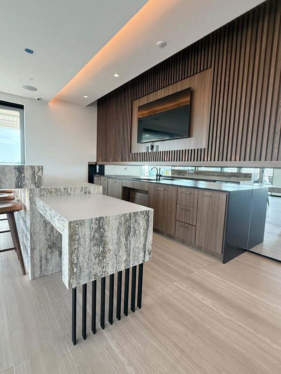 Twelve-story building with 237 residential condominium units. Rough, Finish, and Millwork Carpentry. Concrete Counter Tops. Doors, Frames, and Hardware. Interior Unit and Amenity Trims. Division 10 Specialties. Bathroom Accessories. Closet Shelving. Shower Doors. Landscaping Carpentry. Decking. Exterior Screens and Trellises. Temporary Construction Carpentry.